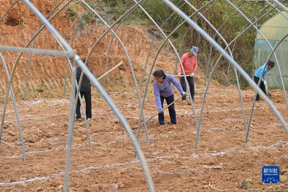 12月5日,在廣西梧州市蒼梧縣木雙鎮粵桂六堡茶産業研學示範園,村民在茶苗大棚裏勞作。