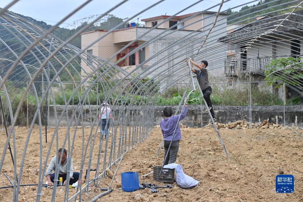 12月5日,在廣西梧州市蒼梧縣木雙鎮粵桂六堡茶産業研學示範園,村民搭建茶苗大棚。