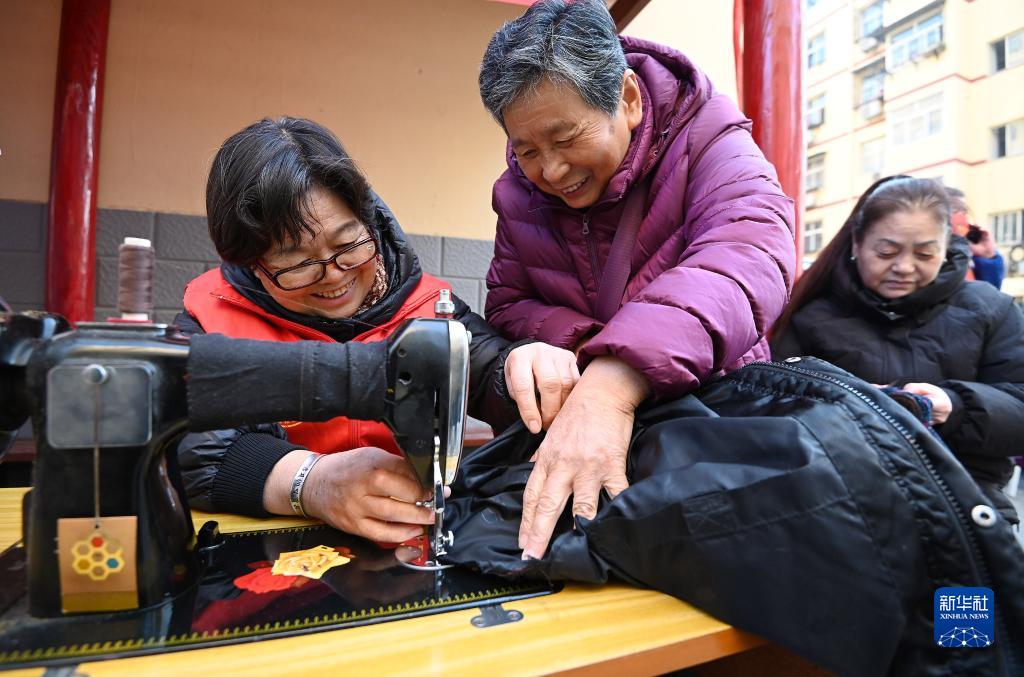 12月5日,在河北省邯鄲市叢&區,志願者為居民義務修補衣服。