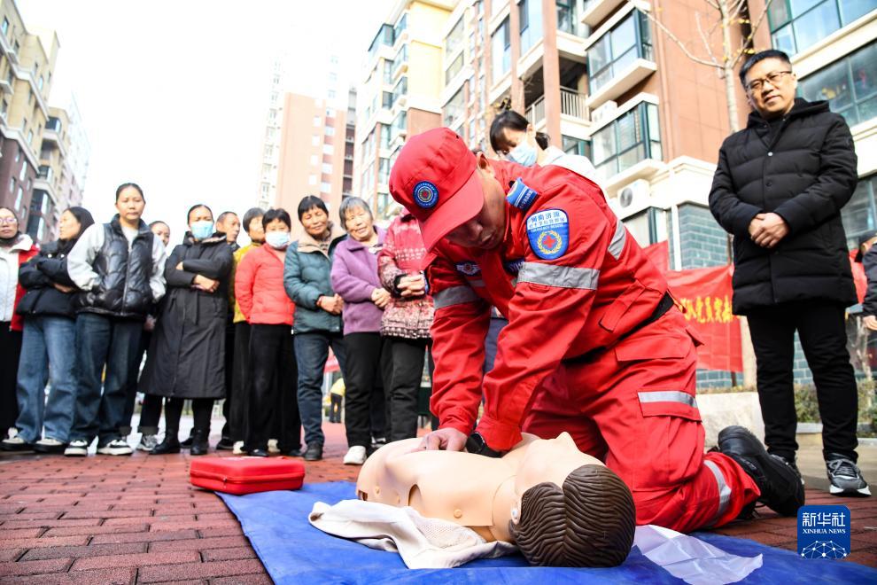 12月5日,在河南省濟源市園丁苑小區廣場,濟源市紅十字應急救援隊的志願者為市民講解應急救援知識。