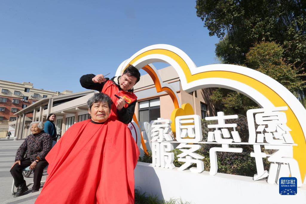12月5日,在浙江省湖州市德清縣阜溪街道獅山未來社區,志願者為居民理髮。