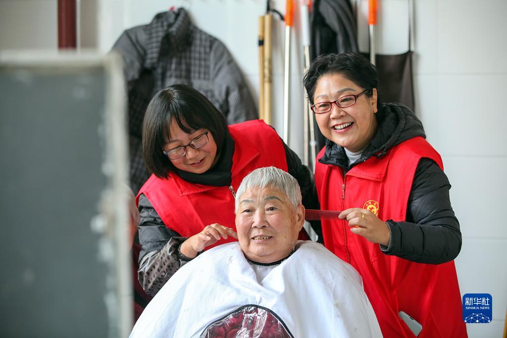 12月5日,在河南省焦作市博愛縣春暉養老院,志願者為老人理髮。