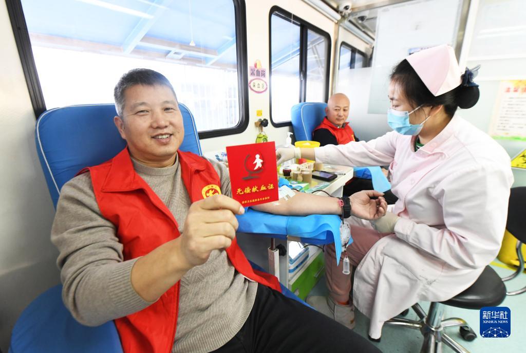 12月5日,在河北石家莊新樂市新興路獻血屋內,志願者無償獻血。