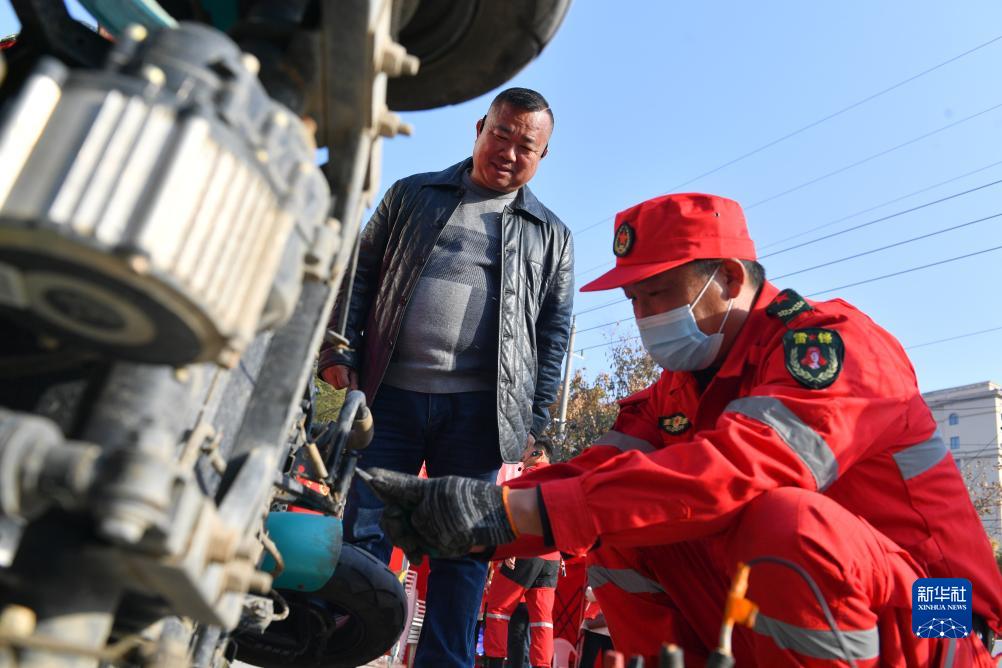 12月5日,河南省夏邑縣雷鋒救援服務隊的志願者為市民義務修車。