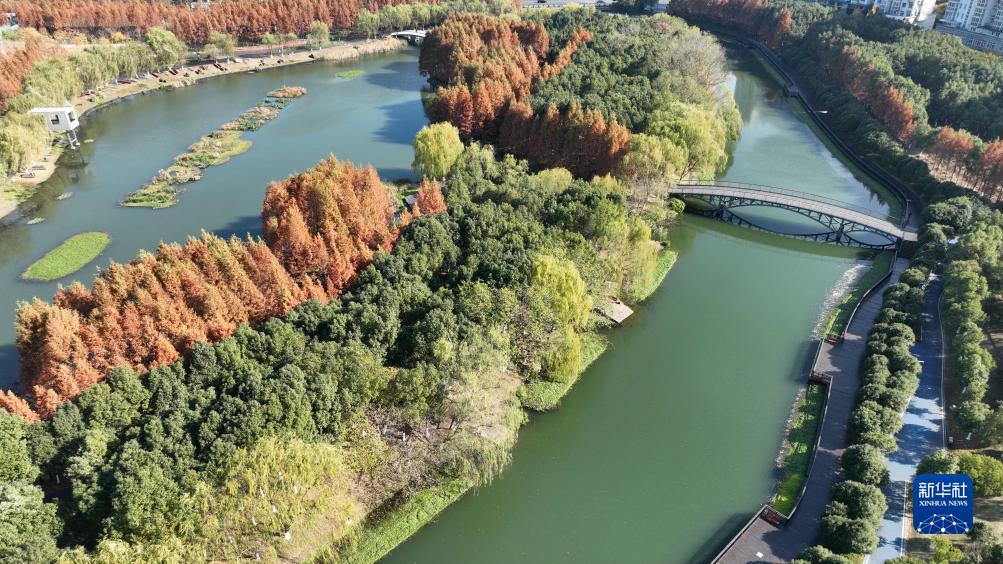 12月5日,浙江省湖州市德清縣武康街道余英溪公園層林盡染,風景如畫(無人機照片)。
