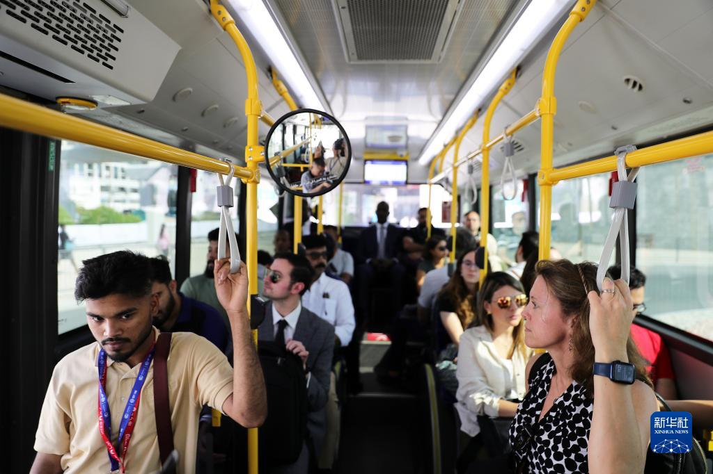 12月3日,在聯合國氣候變化迪拜大會,人們乘坐中國蘇州金龍公司的海格電動巴士。