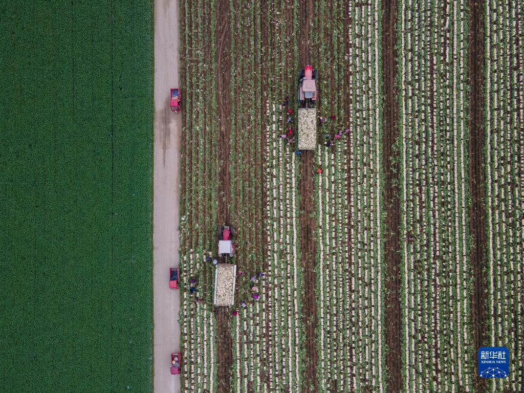 12月5日,在重慶市合川區太和鎮,村民們在重慶市康東蔬菜種植股份合作社將收穫的白蘿蔔裝車(無人機照片)。