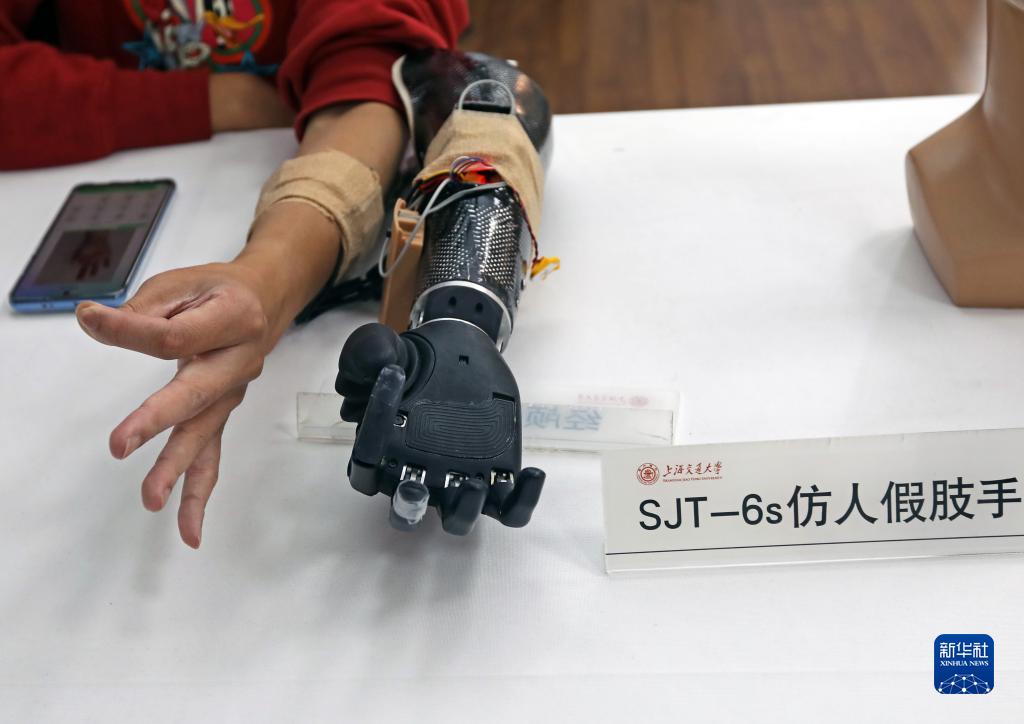 在上海交大機器人研究所的生機電實驗室,學生在展示智能假肢(11月24日攝)。