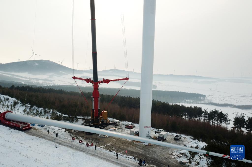 12月5日拍攝的華電黑龍江區域哈爾濱依蘭雞冠山風電場四期項目風電機組吊裝現場(無人機照片)。
