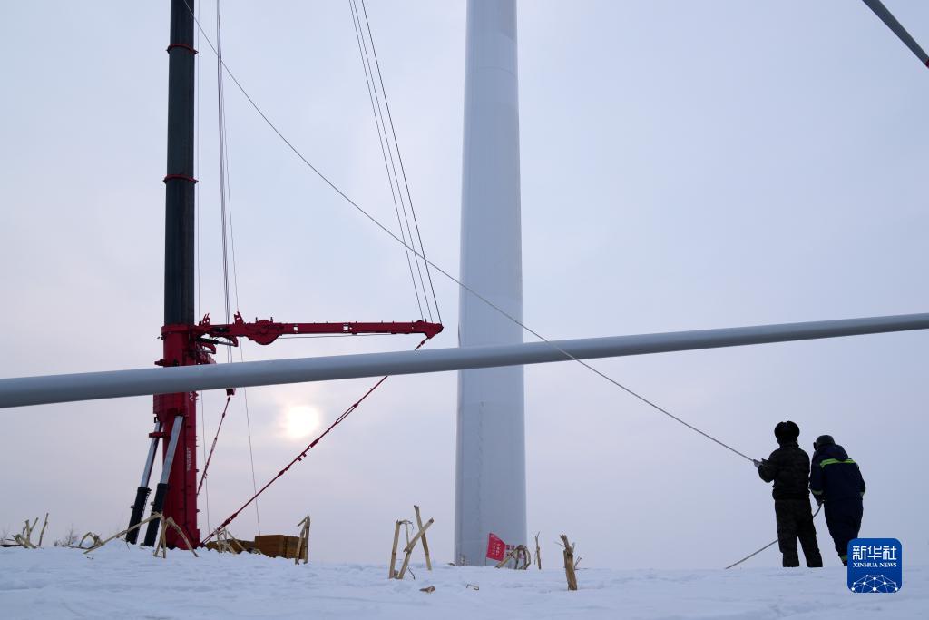 12月5日,工人在華電黑龍江區域哈爾濱依蘭雞冠山風電場四期項目風電機組吊裝現場作業。