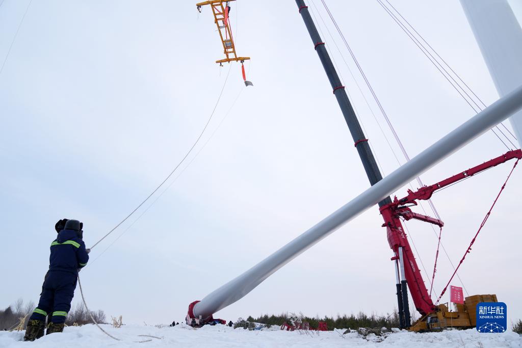 12月5日,工人在華電黑龍江區域哈爾濱依蘭雞冠山風電場四期項目風電機組吊裝現場作業。