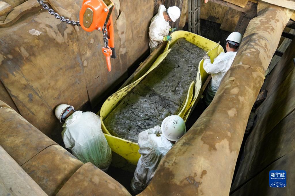 11月8日,在重慶市武隆區,考古工作人員對“關口西漢一號墓”的木棺進行打包提取。