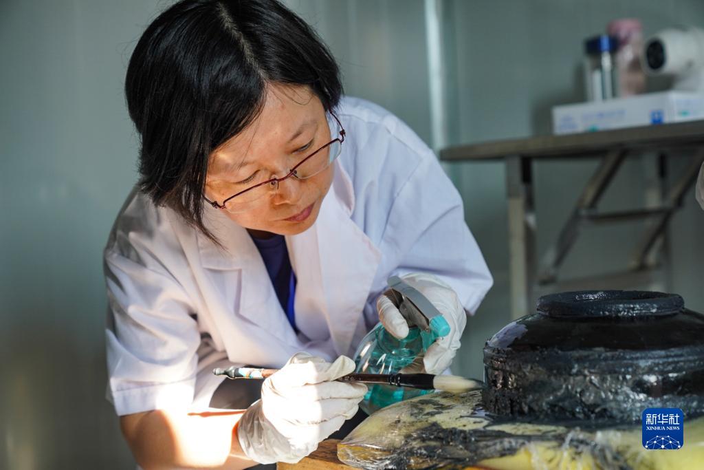 10月14日,在重慶市武隆區,重慶市文物考古研究院工作人員在清洗從“關口西漢一號墓”出土的器物。