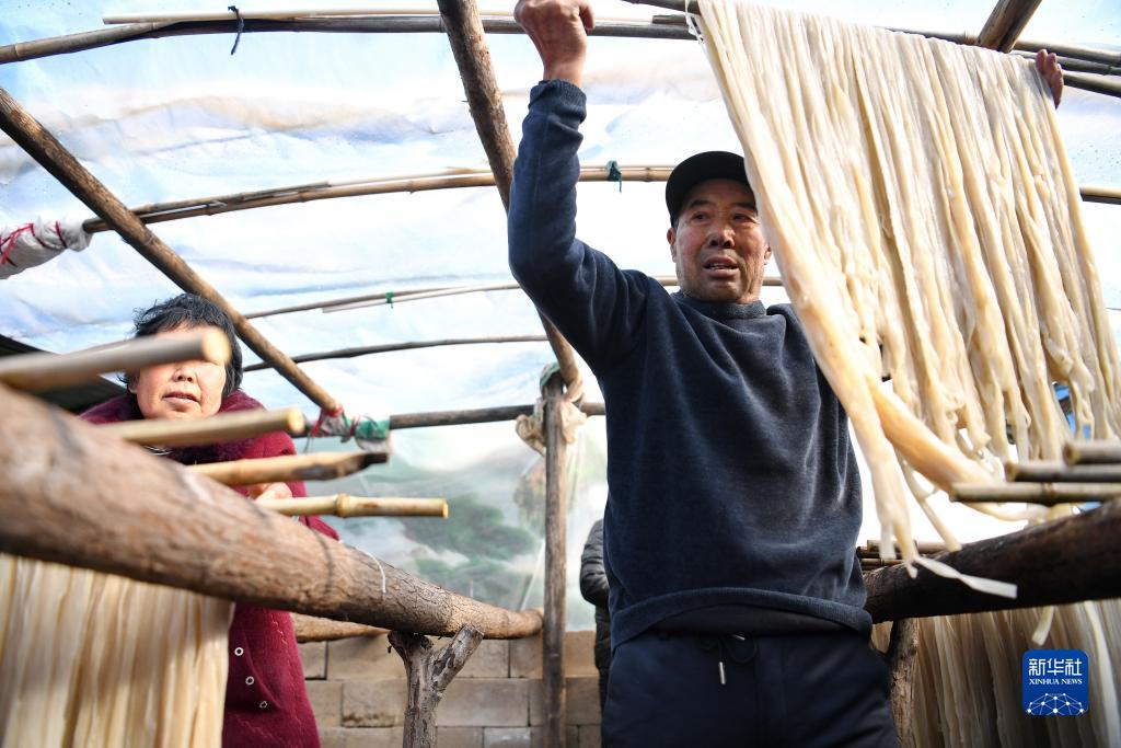 初冬時節,氣溫驟降,正是傳統手工粉條加工的好時節。在河北省遷安市,農民們忙着加工晾曬粉條供應市場。近年來,遷安市着力構建“一村一品”産業發展格局,鼓勵有條件的村莊和農戶利用冬閒時節從事粉條加工産業,不斷開拓省內外市場,有效拓寬群眾增收途徑。