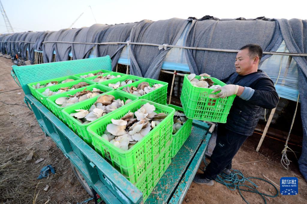 12月6日,在邯鄲市肥鄉區毛演堡鎮路堡村,菇農在搬運菌菇。