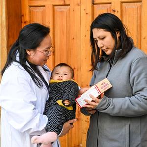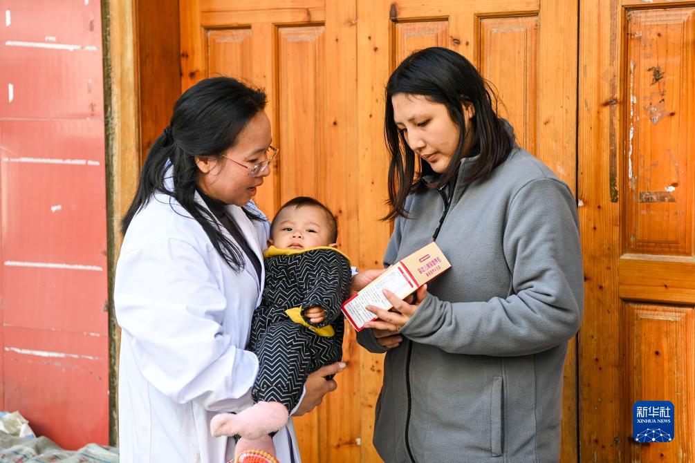 12月6日,在廣西鍾山縣花山瑤族鄉林坪村,唐麗紅(左)給一名婦女講解嬰兒輔食營養包的使用方法。
