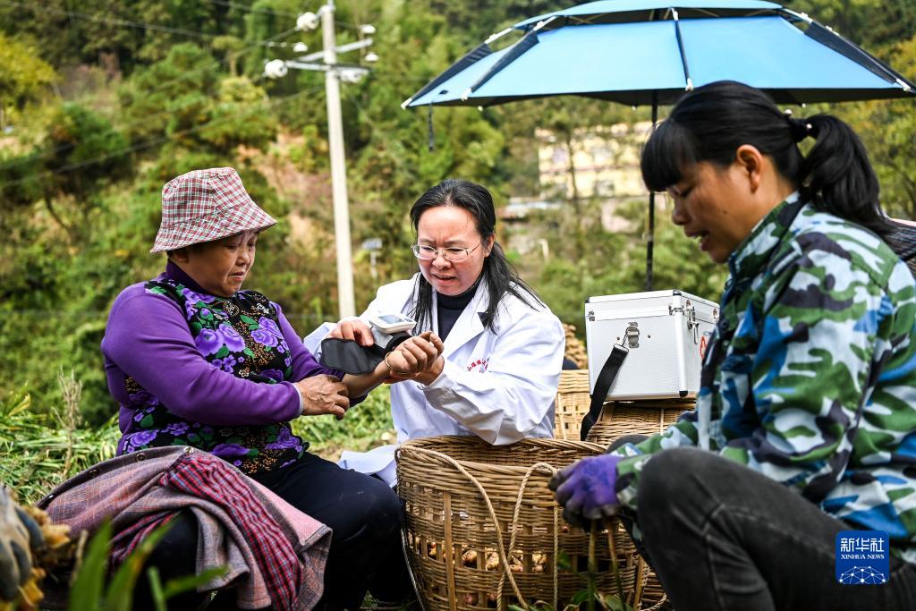 12月6日,在廣西鍾山縣花山瑤族鄉林坪村,唐麗紅(中)在田間地頭給村民測量血壓。