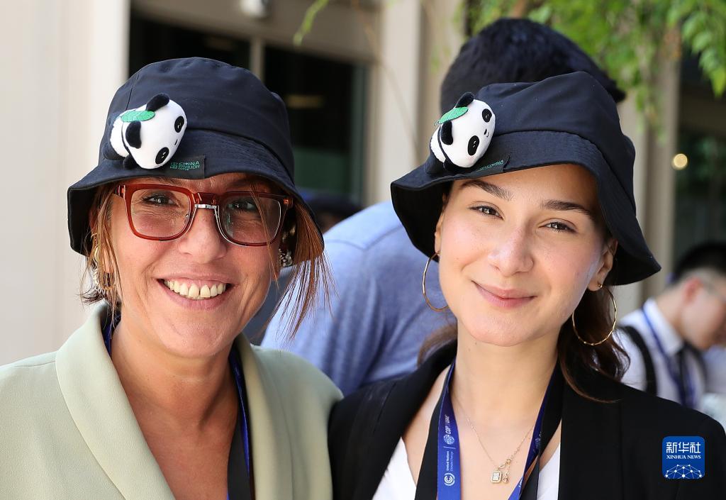 12月6日,在聯合國氣候變化迪拜大會中國角,參會者戴上有熊貓裝飾的帽子拍照。
