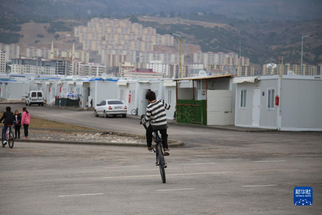 12月6日,在土耳其卡赫拉曼馬拉什,一名男孩在“集裝箱社區”內騎自行車。