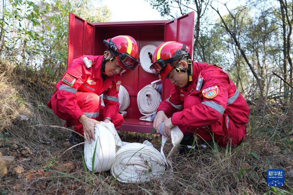 12月7日,在長沙岳麓山風景名勝區桃花嶺景區,森林消防員在演練中檢查森林消防“管網上山”設施。
