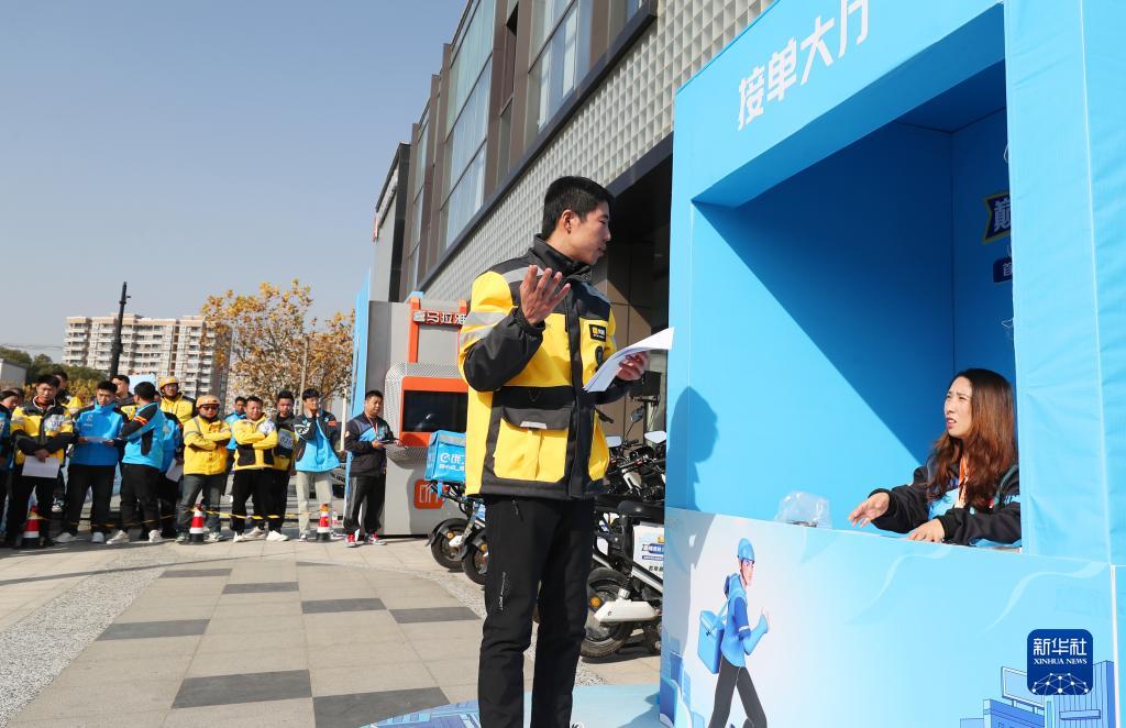 12月7日,一名配送員在比賽中與訂單派發窗口工作人員明確訂單信息。