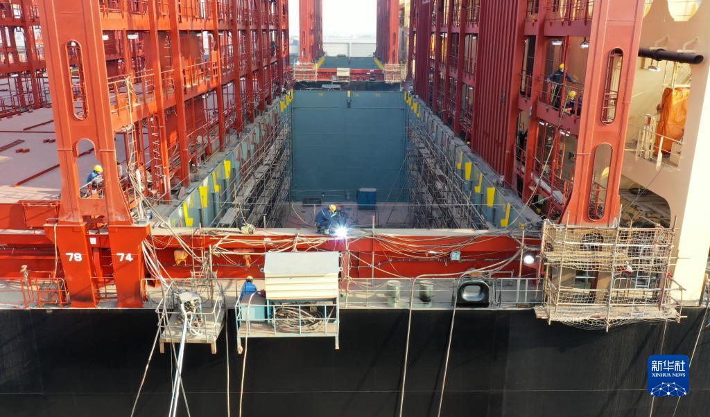 12月5日,在位於江蘇省泰興市的江蘇揚子鑫福造船有限公司,工人在一艘集裝箱船上作業(無人機照片)。