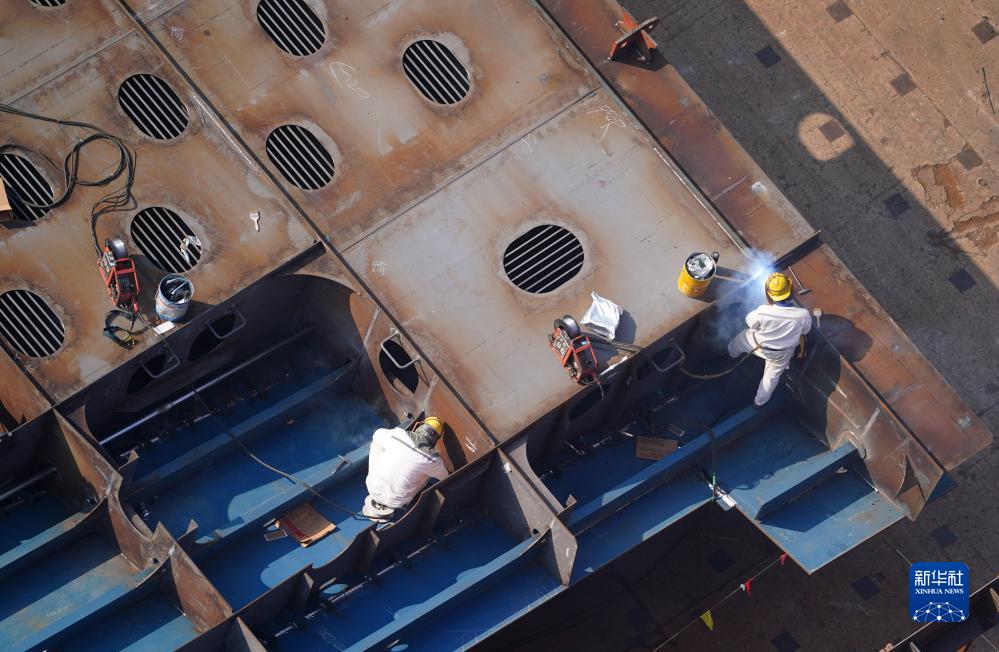 12月5日,在位於江蘇省泰興市的江蘇揚子鑫福造船有限公司,工人在集裝箱船的零部件上作業。