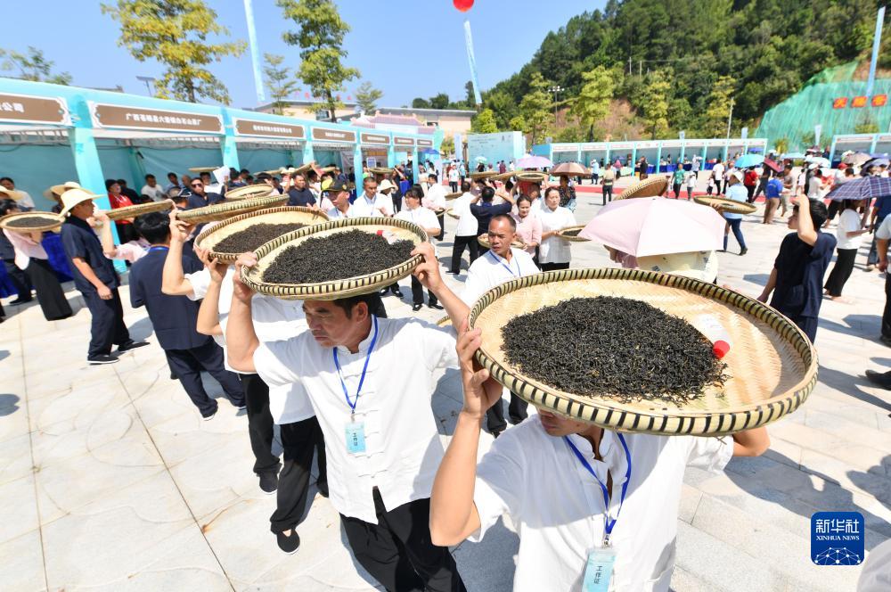 在梧州市蒼梧縣六堡鎮六堡茶文化廣場,當地制茶人準備進行封茶儀式(10月15日攝)。