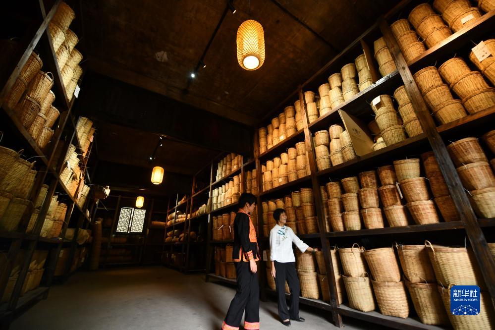 在梧州市蒼梧縣六堡鎮黑石山茶廠,六堡茶製作技藝非遺傳承人韋潔群(右)、祝雪蘭在交流制茶技藝(9月6日攝)。