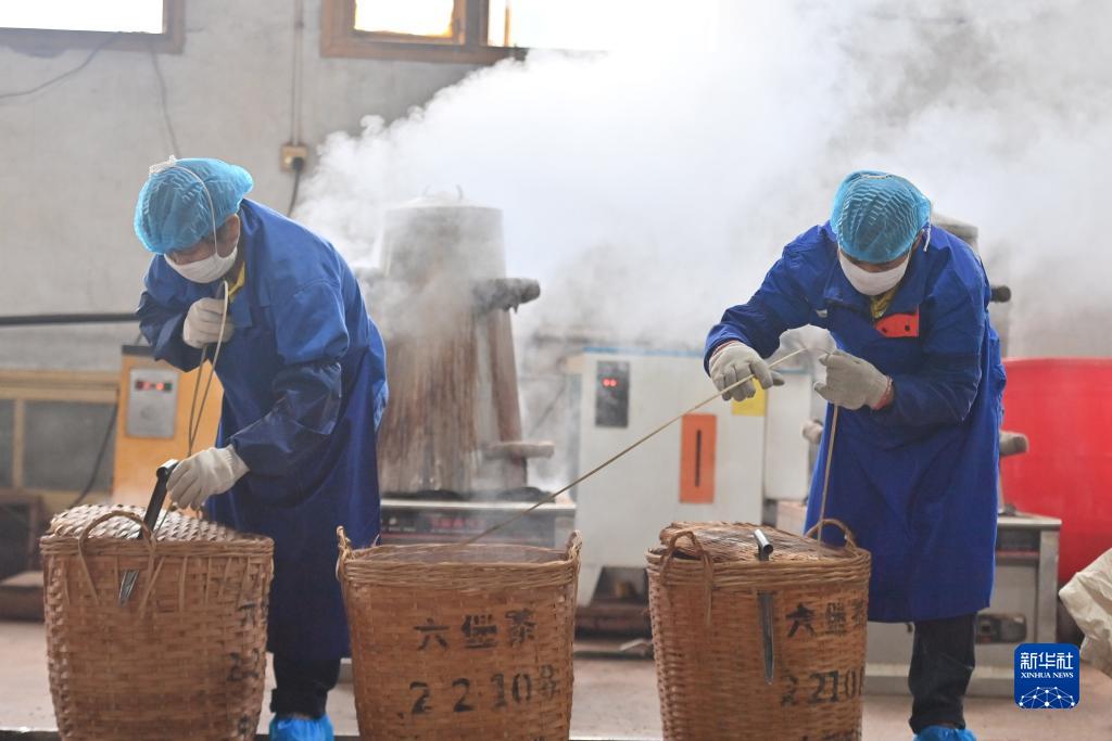 在梧州市中茗茶業有限公司,工人在蒸茶、壓筐(11月29日攝)。