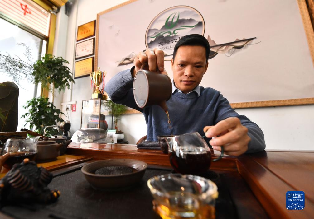 在梧州市蒼梧縣大澤六堡茶業有限公司,六堡茶製作技藝非遺傳承人韋湛生在泡茶(12月5日攝)。