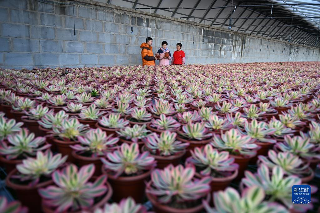 12月7日,農民在河北省唐山市豐南區胥各莊鎮一處大棚內向顧客介紹多肉植物。