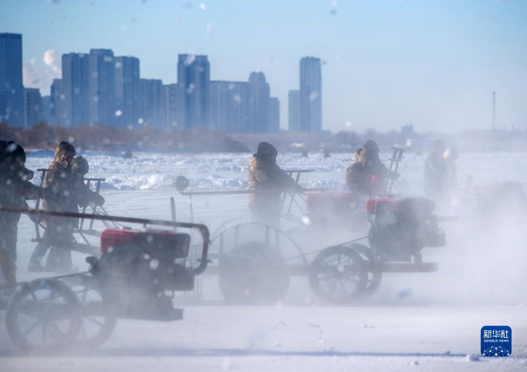 12月7日,工作人員在第四屆哈爾濱採冰節活動現場採冰。