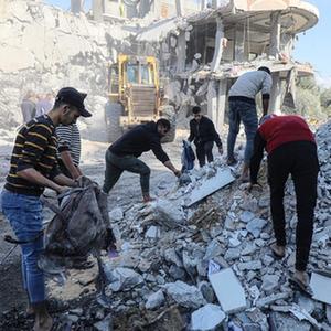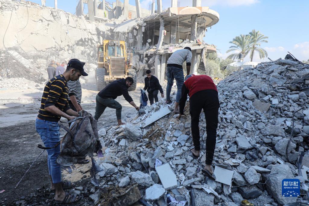 12月6日,在加沙地帶代爾拜拉赫,人們查看以軍空襲後的廢墟。