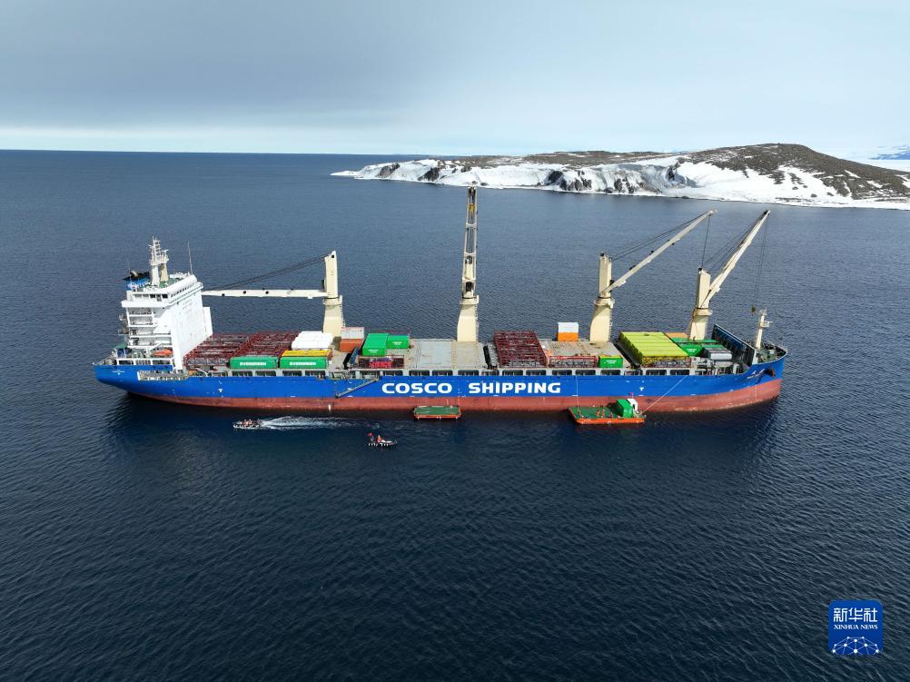 12月7日,執行中國第40次南極考察任務的“天惠”輪開展卸貨作業(無人機照片)。