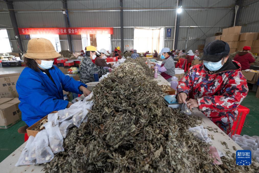 12月7日,在蘄春縣高新鋪村的就業幫扶車間,工人在對蘄艾進行初加工。