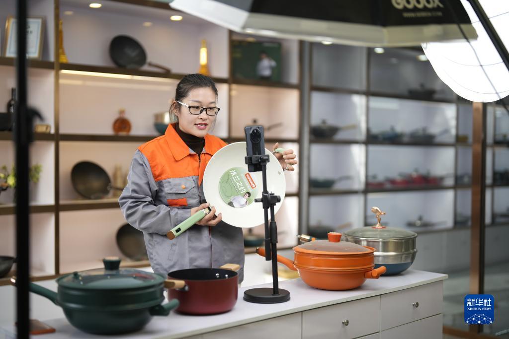 12月7日,玉田縣一家廚具生産企業的工作人員在利用直播的方式推介鍋具産品。