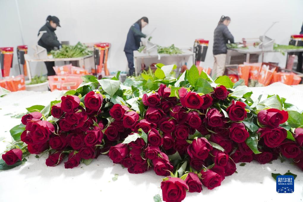 12月7日,在山東省新泰市樓德鎮,工作人員在加工剛採摘的玫瑰。