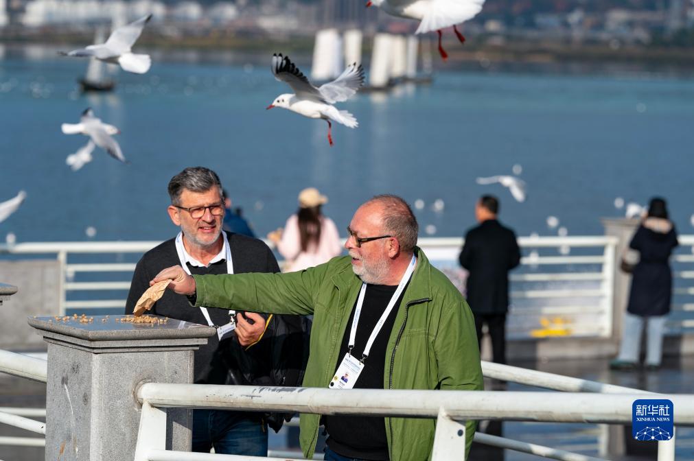 12月7日,世界媒體峰會參會代表在昆明海埂大壩喂紅嘴鷗。