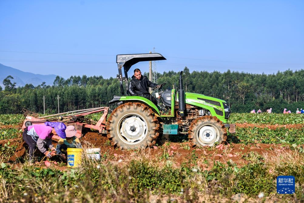12月7日,在廣西鍾山縣一處紅薯種植基地,村民在采收紅薯。