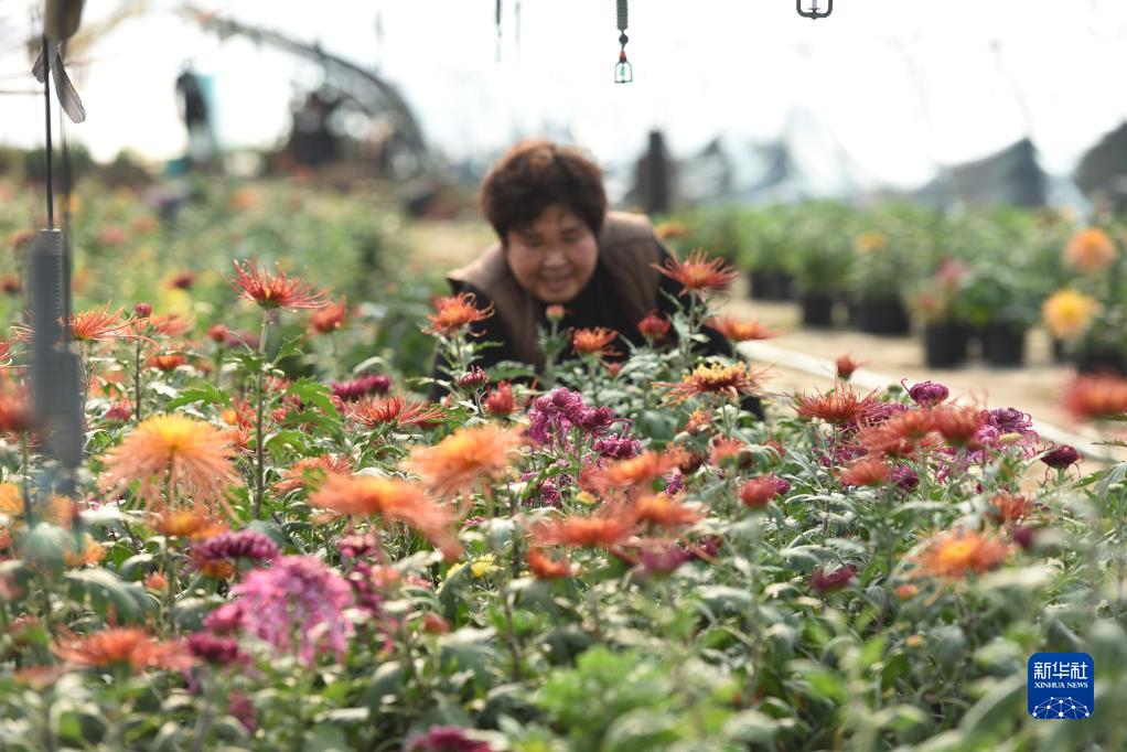 12月7日,花農在山東省臨沂市郯城縣馬頭鎮花卉大棚基地內勞作。