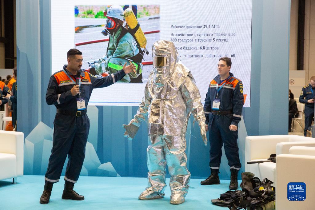 12月7日,工作人員在俄羅斯聖彼得堡舉行的第十三屆“北極:現狀和未來”國際論壇上介紹特殊防護服。