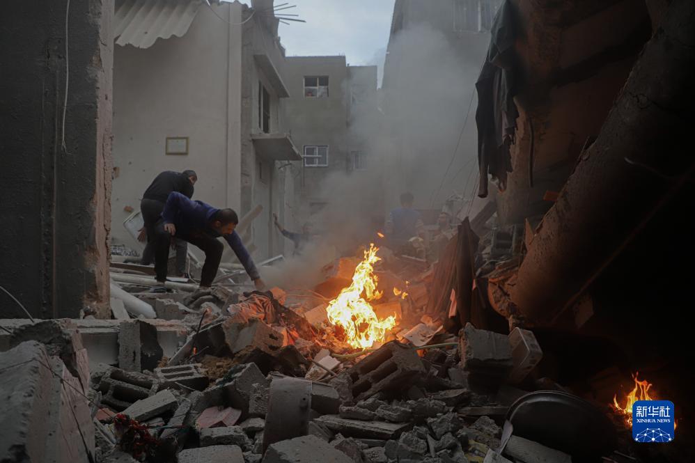 12月7日,在加沙地帶南部城市汗尤尼斯,巴勒斯坦人查看遭以軍襲擊後的建築廢墟。