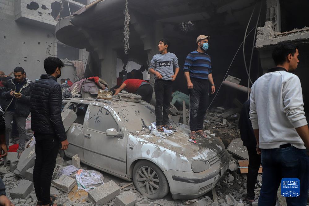12月7日,在加沙地帶南部城市汗尤尼斯,巴勒斯坦人查看遭以軍襲擊後的廢墟。