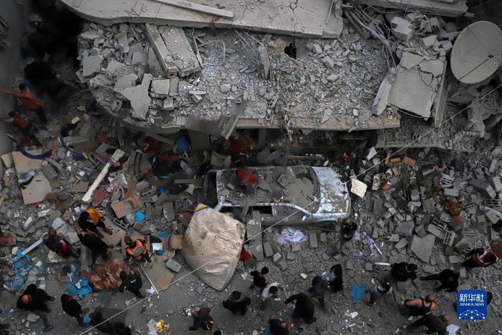 12月7日,在加沙地帶南部城市汗尤尼斯,巴勒斯坦人查看遭以軍襲擊後的建築廢墟。