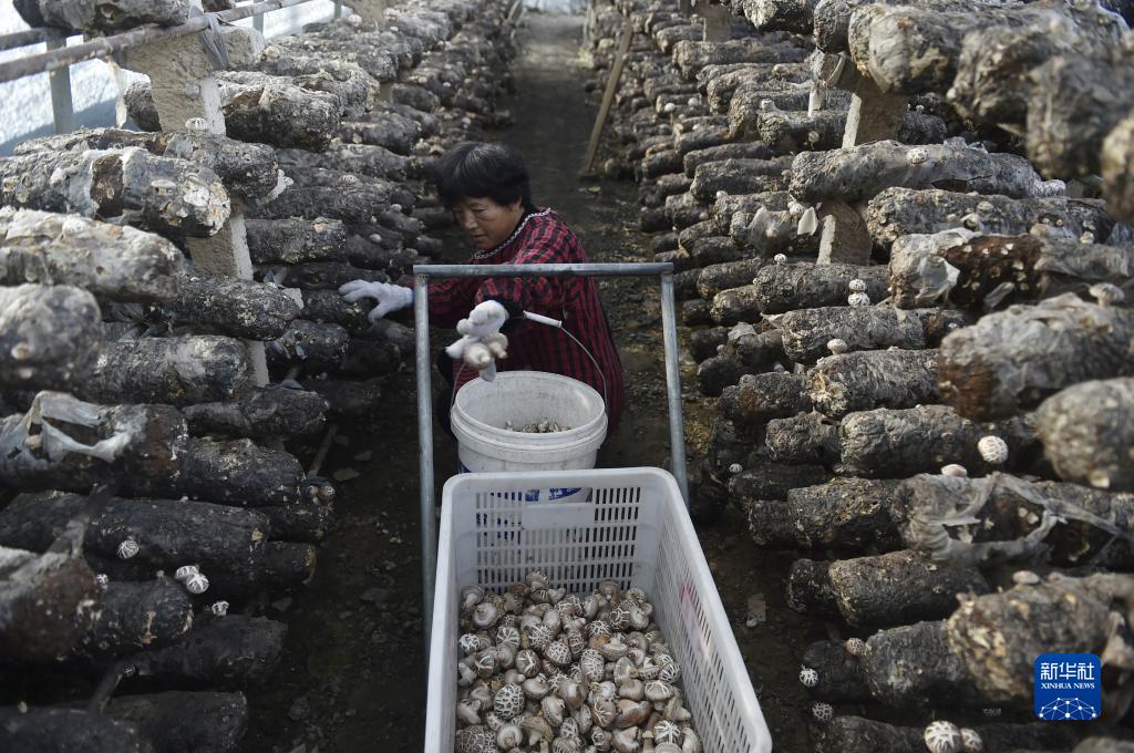 12月7日,朱寨村村民在種植大棚裏採摘香菇。