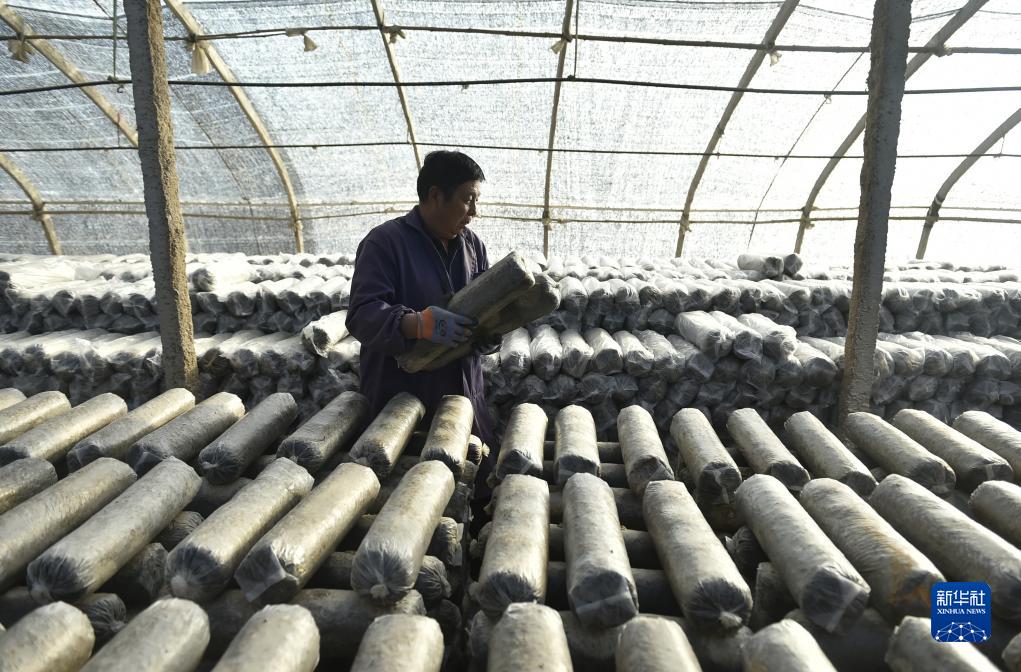 12月7日,朱寨村村民在種植大棚內整理香菇菌棒。