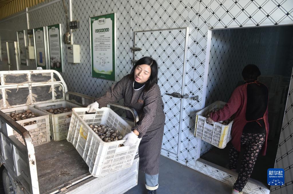 12月7日,朱寨村村民將採摘的香菇搬進冷庫臨時存放,準備外銷。