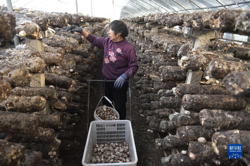 12月7日,朱寨村村民在種植大棚裏採摘香菇。
