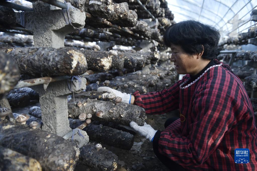 12月7日,朱寨村村民在種植大棚裏採摘香菇。
